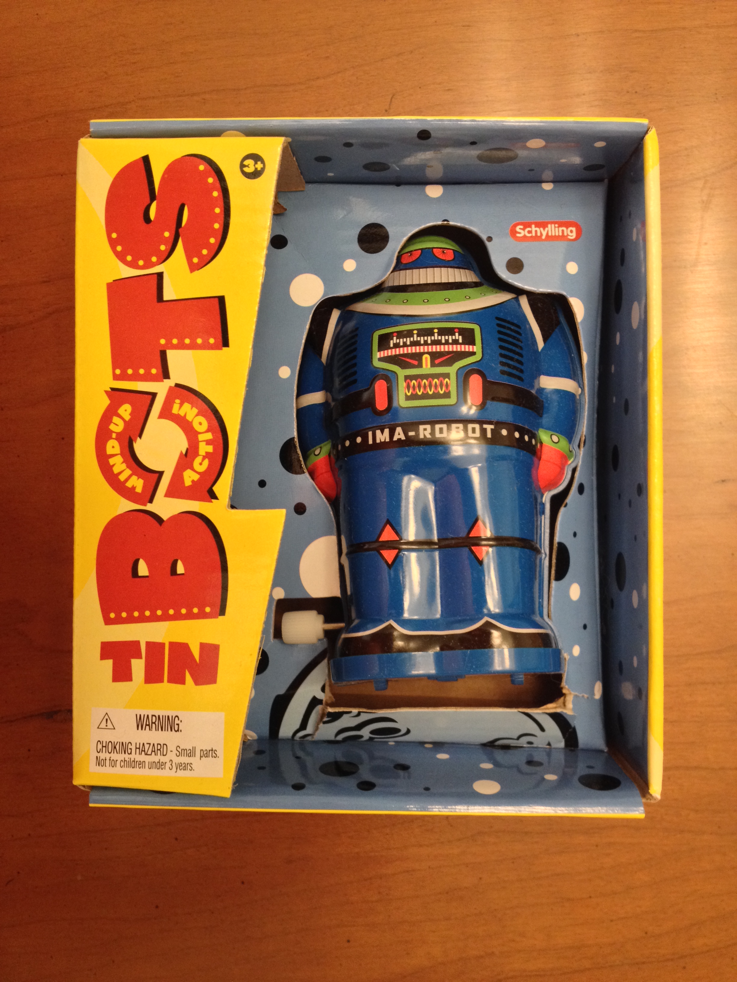 Yes, that’s a tin wind-up robot. It’s only a couple inches tall, but that just makes it that much easier for it to scoot across the table. I especially love that I got the one named “Ima-Robot”. This is exactly the sort of goofy little toy that appeals to me, and it went right into my kitsch collection in my office along with my Pip-Boy Bobble Head and Stay-Puft Marshmallow Man.